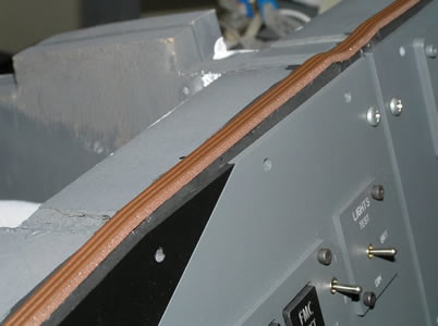 En este punto tenemos los tres muebles colocados en su sitio, los tres monitores y los cables de alimentación. Por otro lado ya teníamos preparados los paneles frontales de capitán, Eicas, primer oficial, y los que van en las rodillas. Procedo a colocarlos en su sitio, teniendo cuidado con no dañar ninguno de los cables. Ahora conecto y ordeno todos los cables del interior y los fijo con bridas. Una vez hecho esto y antes de colocar la parte superior, coloco esta cinta adhesiva para que el módulo superior ajuste perfectamente con el interior (la pinto de negro también para que se vea lo menos posible después):