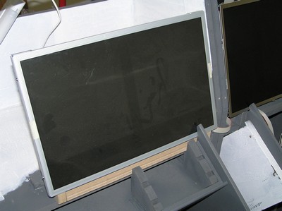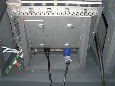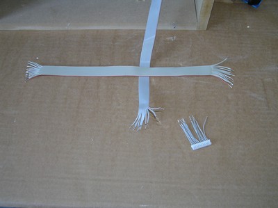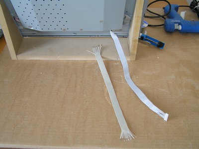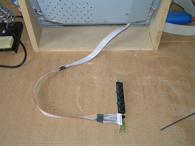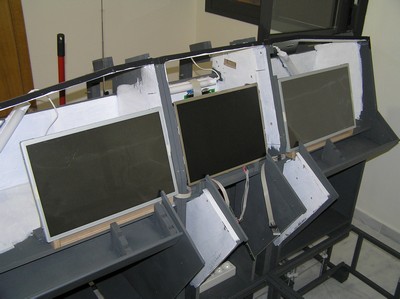 Una vez fijados los tres módulos, podemos colocar los monitores. Los controles de los mismos (encendido, brillo, etc.) van a ir colocados en la parte trasera del mueble del capitán. Tengo que alargar los cables para que lleguen hasta allí. Es fácil soldando un cable plano y aislando con tubo termoretráctil: