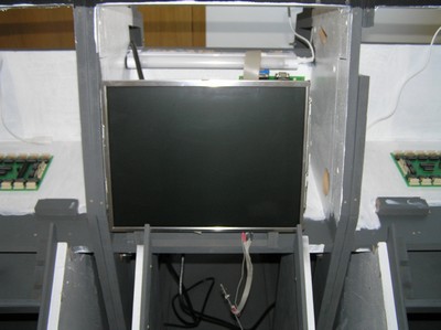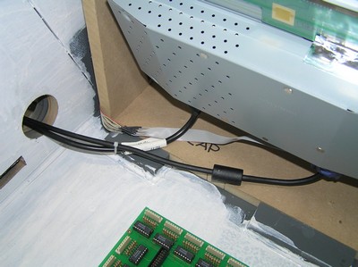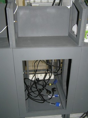 Una vez hecho esto, les enchufamos sus cables poniéndoles una etiqueta identificativa, y los colocamos en su sitio, sujetándolos con tornillos a la base de madera. Todos los cables los llevamos hacia la parte inferior del módulo del EICAS, donde estarán los ordenadores: