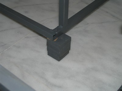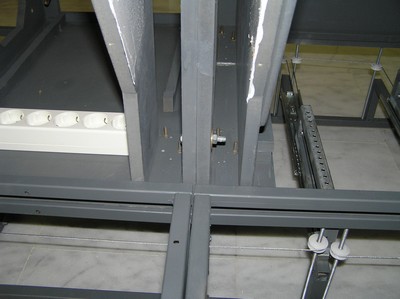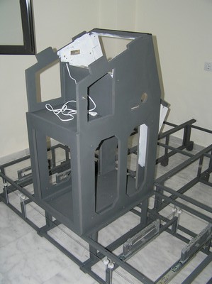 MONTAJE Para mejorar la ergonomía de la cabina, en particular las altura de los ojos con respecto al MCP, y la distancia de los pies a los pedales, he tenido que modificar la altura relativa entre la plataforma de popa y la de proa. La primera la he tenido que elevar 5 cm. con respecto a la segunda. para ello he instalado unas patas como se puede ver aquí: