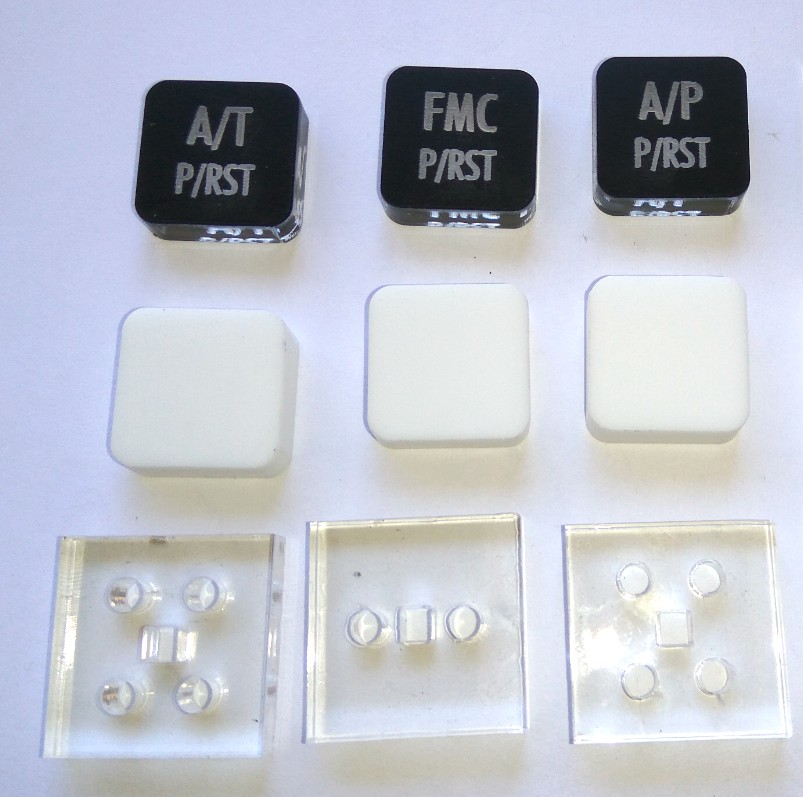 Comenzamos con los pulsadores de doble iluminación, que constan de tres piezas que se pegan con acetona o Acryfix, y se pintan los cantos de negro.