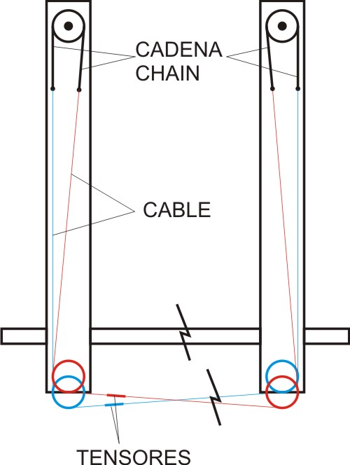 CONSTRUCCION DE LAS COLUMNAS Las columnas van a ir sujetas a una estructura análoga a la que van instalados los pedales. Esta estructura tambien será soporte de los asientos, pedestal y palancas. La idea es montar un sistema de cadenas, cables y poleas como el de la figura: