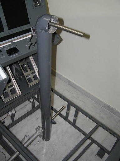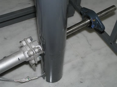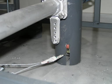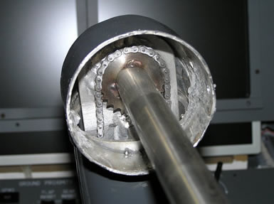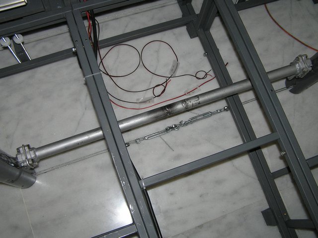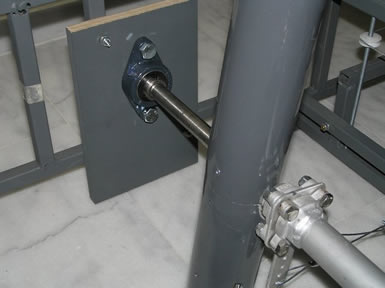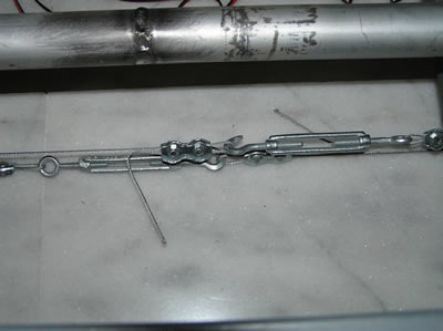 Consta de unos tramos de cadena alrededor del eje de giro de los mandos de vuelo, unidos a unos tramos de cable de forma que se transmita el movimiento de un lado al otro. Para evitar holguras, se usan dos tensores, uno a cada lado de los tramos de cadena. Puesto que con las herramientas de que dispongo me es imposible fabricar esto, he acudido a un taller de calderería de la zona. Aquí vemos el detalle de la polea interior y de la parte inferior de cada columna: