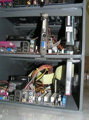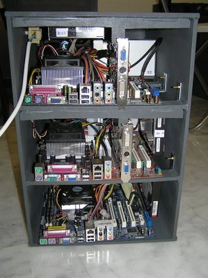 Como el ordenador PC1 va a ser el de la proyección, lo voy a situar cerca del proyector, a la altura del overhead. El resto van a ir instalados en el interior del mueble del Eicas, por lo que les he hecho un rack con paneles de madera: