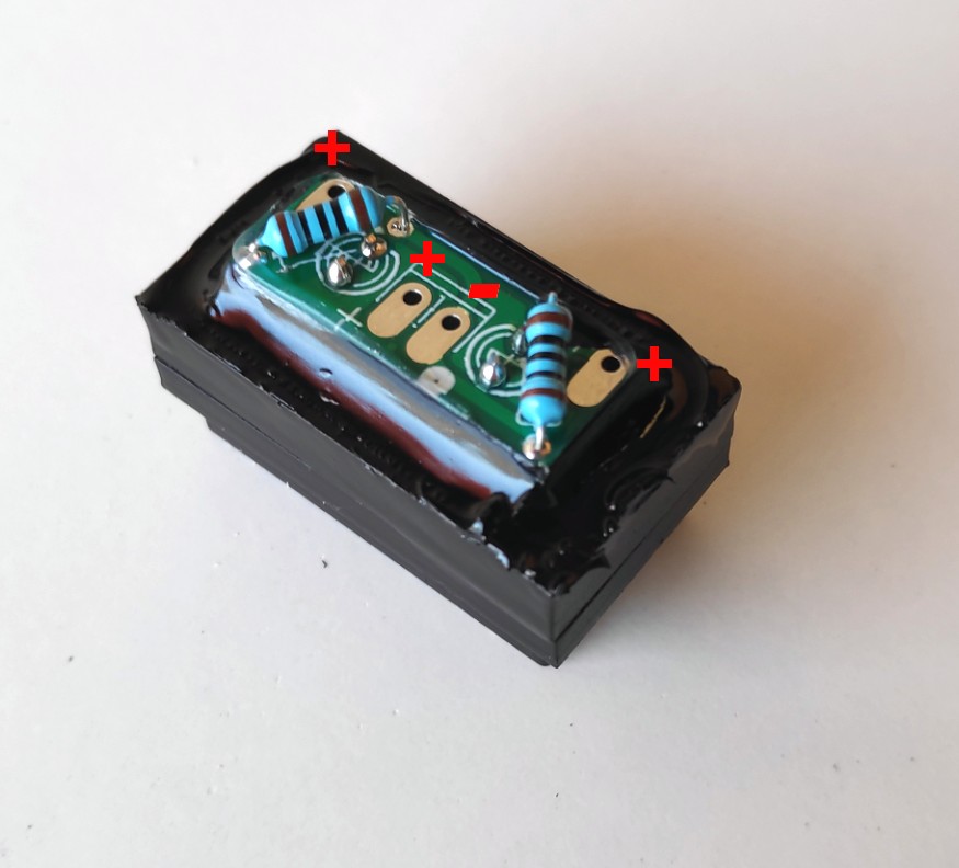 En el centro se puede instalar un conector de 2 pines (el ánodo está marcado con +). Hay dos conexiones adicionales para el ánodo en las esquinas, para poder conectar un anunciador a los que tiene al lado. El pin que apaga o enciende los leds es el cátodo, marcado con un cículo blanco.