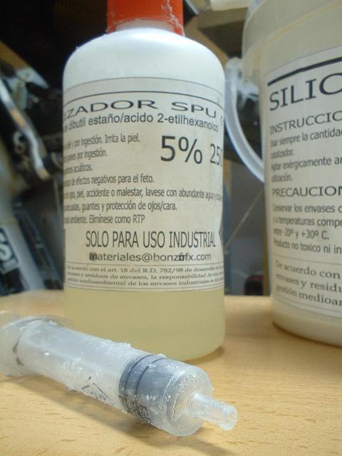 Para hacer que la silicona 'cuaje' tenemos que usar el catalizador SPU al 5%. Esta proporción la podemos hacer por peso, aunque a mi me es más cómoda hacerla por volumen, por lo que uso una jeringuilla, que se puede adquirir en cualquier farmacia: