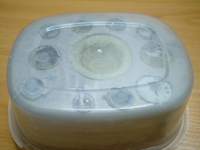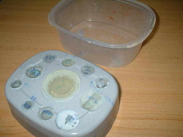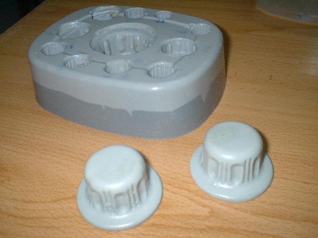 Aspecto antes de desmoldar con los knobs pegados al recipiente. Hay que tener especial cuidado al sacar el molde. Si nos es muy difícil, rompemos el recipiente. Por eso es conveniente que el recipiente sea de plástico: