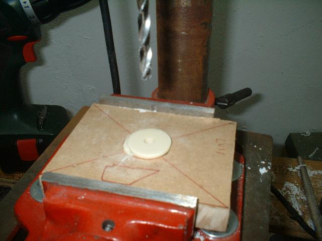 Pero si no disponemos de él, un buen taladro vertical nos puede servir, eso sí, hay que ser finos. Empezamos por el agujero del eje (6 mm.). Yo me he hecho un útil en madera que me mantiene la pieza en su sitio, sin moverse y centrada al eje de la broca: