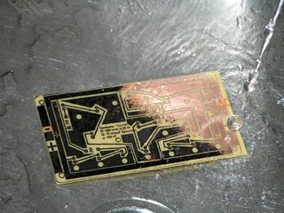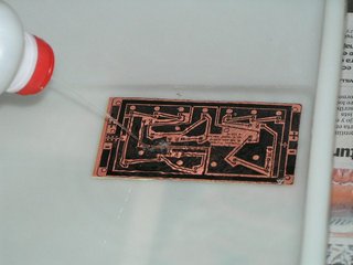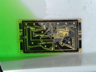 step is to put the board in an acid solution (I use a 23% solution of HCl and hydrogen peroxide H2O2)